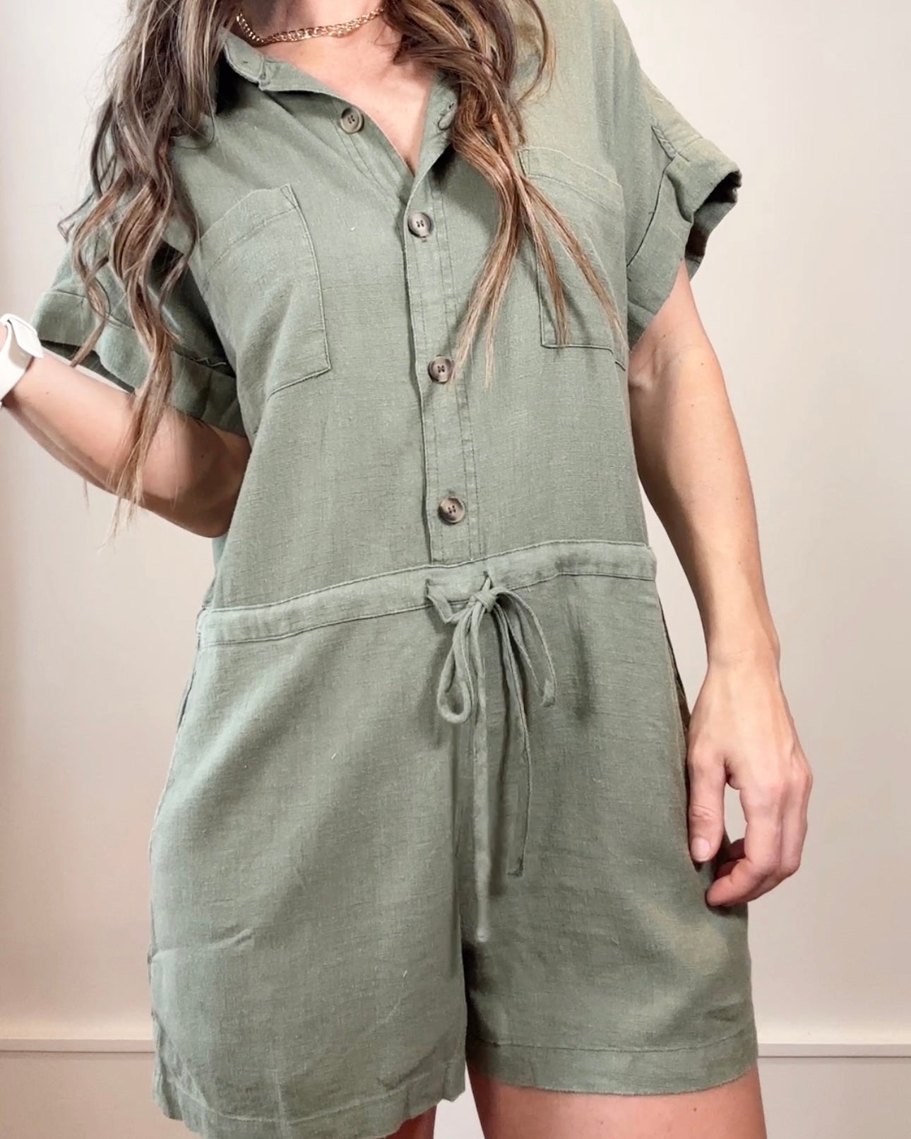 Effortlessly chic and super comfy, this short sleeve button-down romper is perfect for warm-weather days, casual outings, or weekend getaways. Crafted from a breathable blend of 70% viscose and 30% linen, it offers the perfect balance of softness and durability. The button-down design and relaxed fit make it a versatile piece you’ll wear on repeat, whether you’re lounging or out exploring.