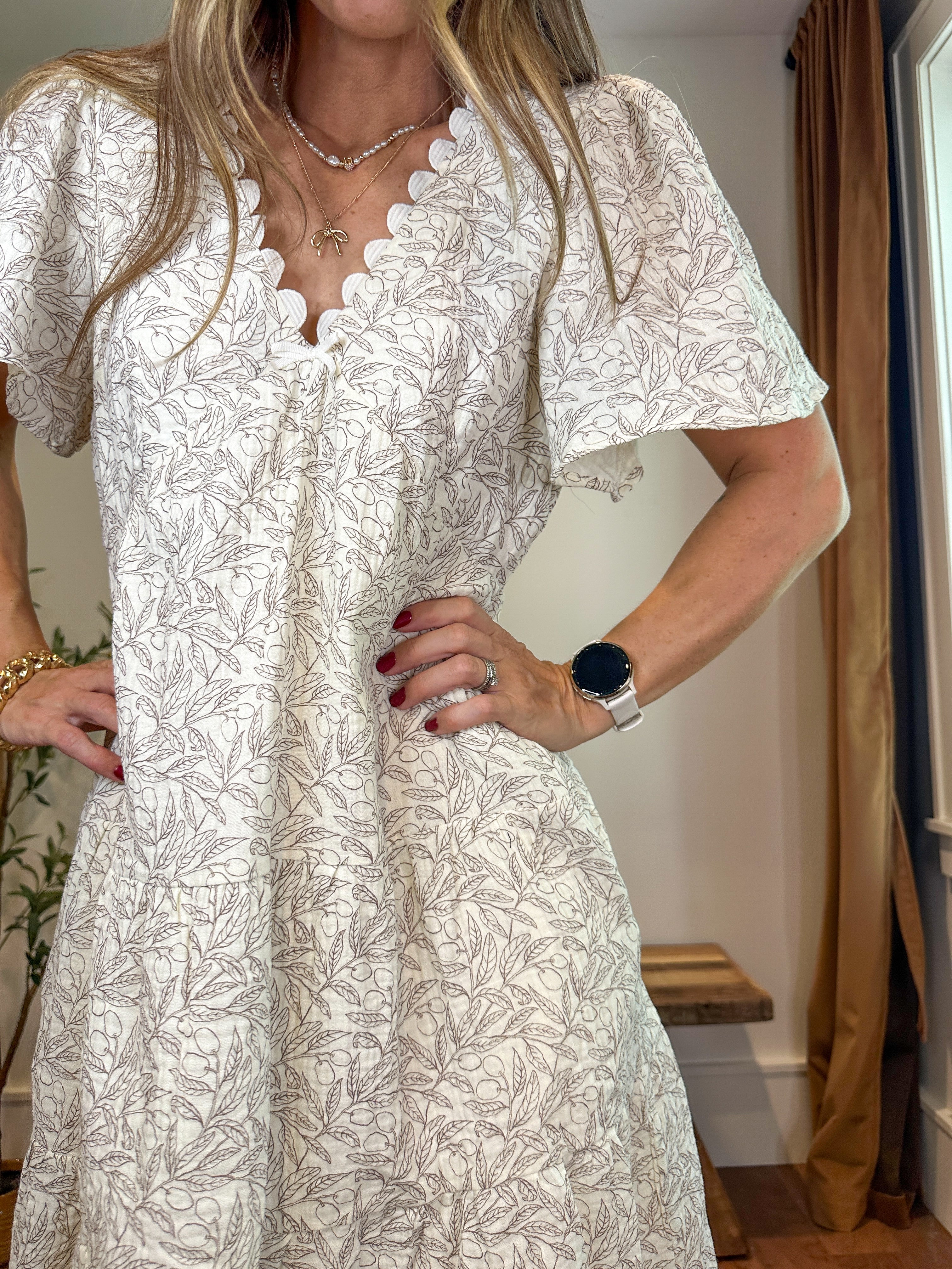 Embrace effortless charm with the Willow Leaf Mini Dress. Crafted from lightweight cotton gauze, this dress features a delicate leaf print, scallop-trimmed edges, and a flattering V-neckline. The elasticized empire waist and tiered mini length create a relaxed, flowy silhouette, perfect for sunny days or layering with a cozy sweater in cooler weather. An easy, breezy piece that combines comfort and feminine style.