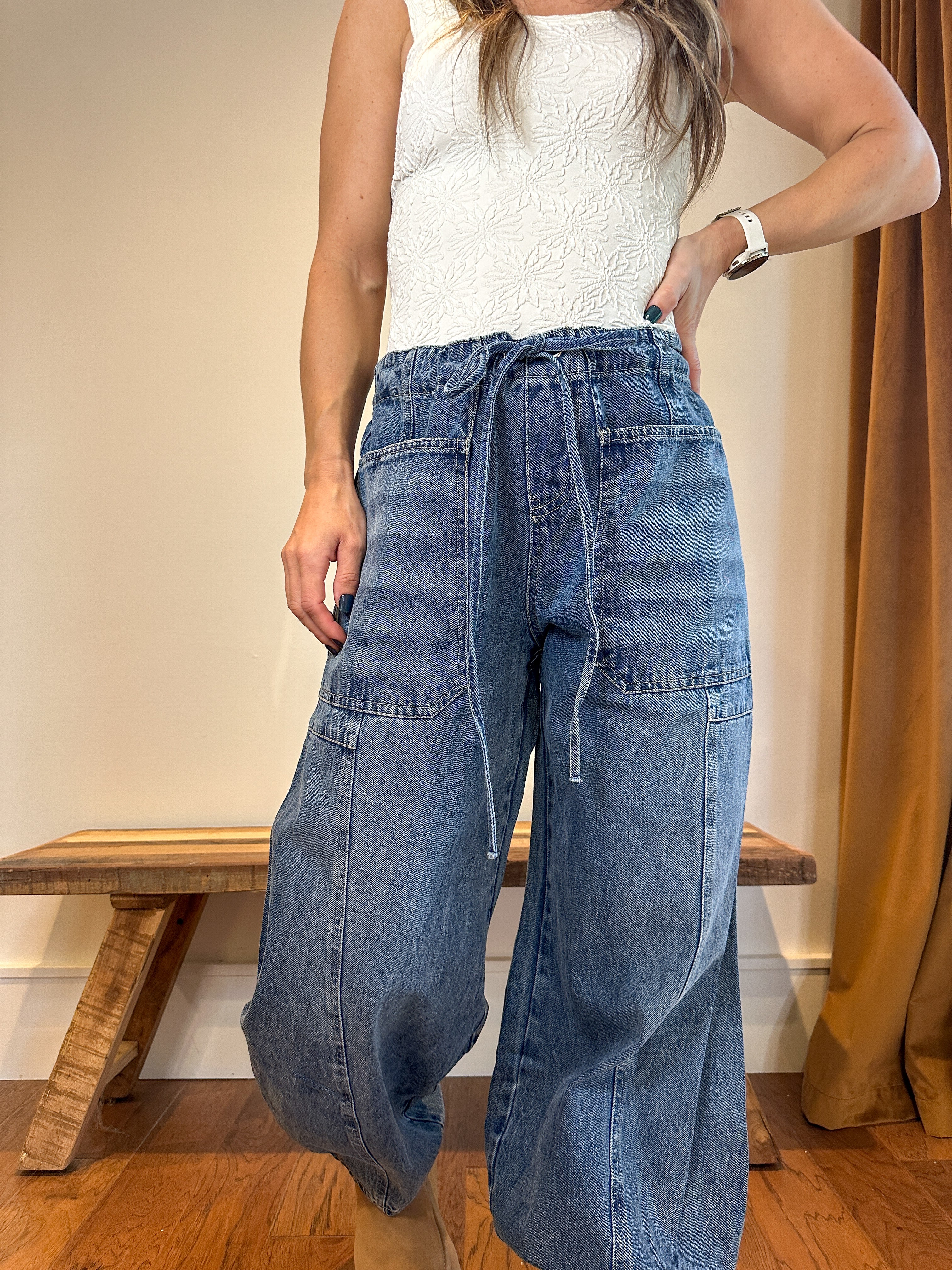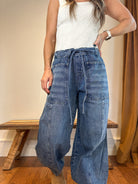 Effortlessly chic and comfortable, the Skyline Cropped Wide-Leg Denim combines modern style with casual ease. Featuring a relaxed wide-leg silhouette and cropped length, these pants are designed with elastic at the back for added comfort, a tie drawstring closure, and two open side hip pockets for practicality. Added seam detailing and two back pockets elevate the classic denim look, making these versatile pants perfect for everyday wear or casual outings.