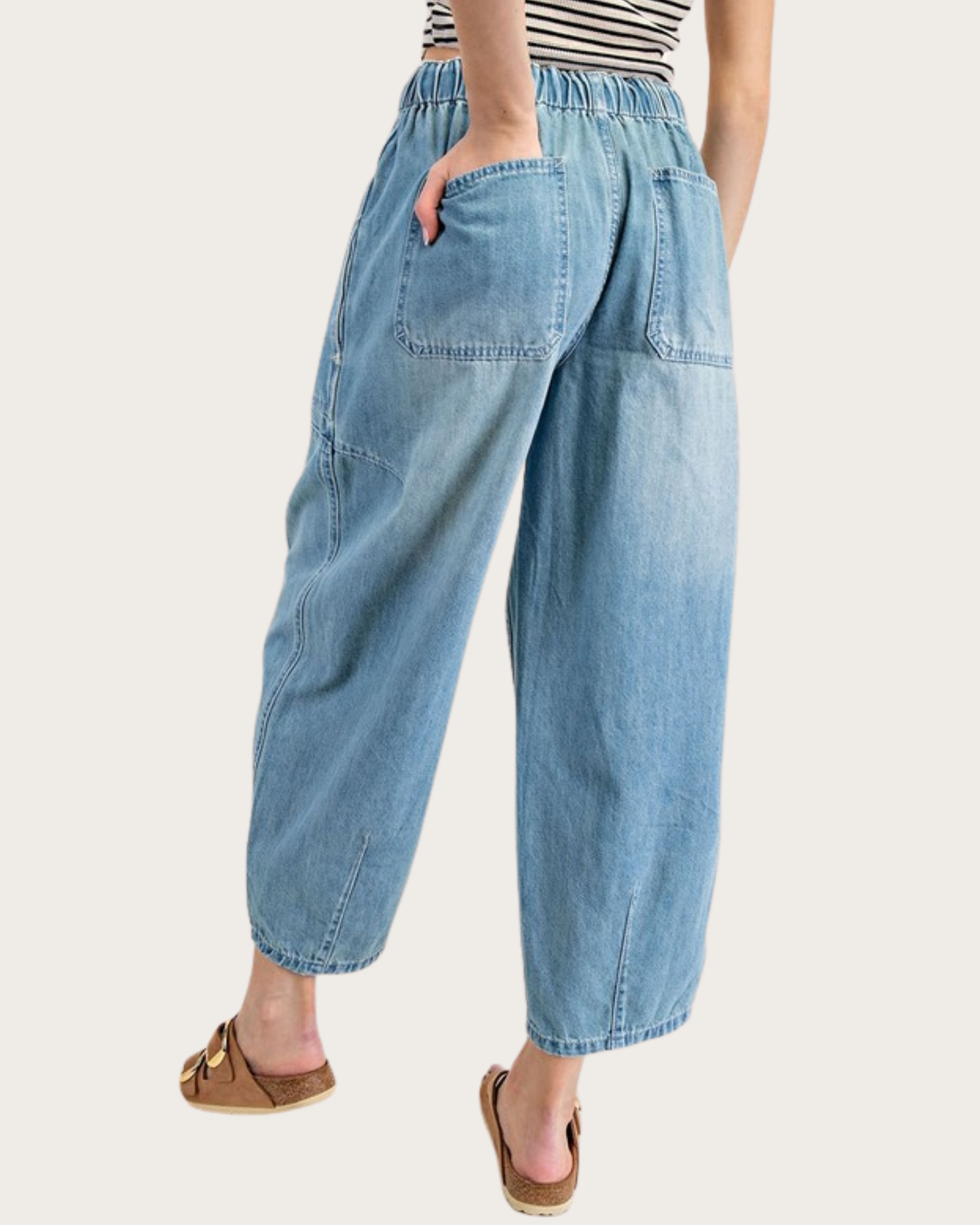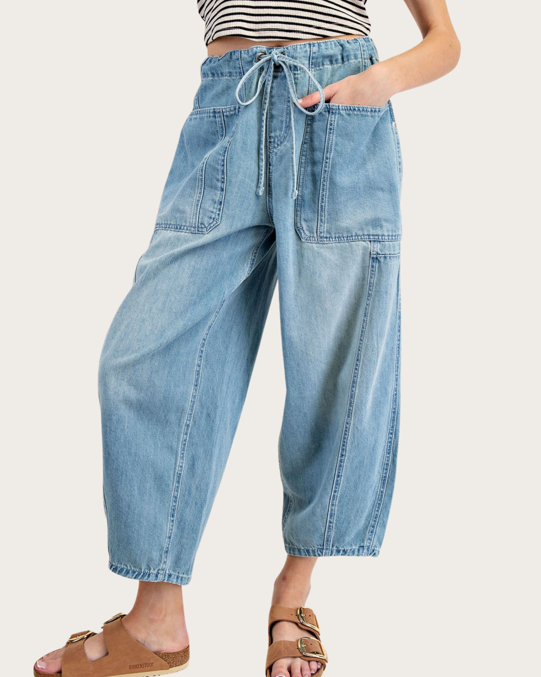 Effortlessly chic and comfortable, the Skyline Cropped Wide-Leg Denim combines modern style with casual ease. Featuring a relaxed wide-leg silhouette and cropped length, these pants are designed with elastic at the back for added comfort, a tie drawstring closure, and two open side hip pockets for practicality. Added seam detailing and two back pockets elevate the classic denim look, making these versatile pants perfect for everyday wear or casual outings.