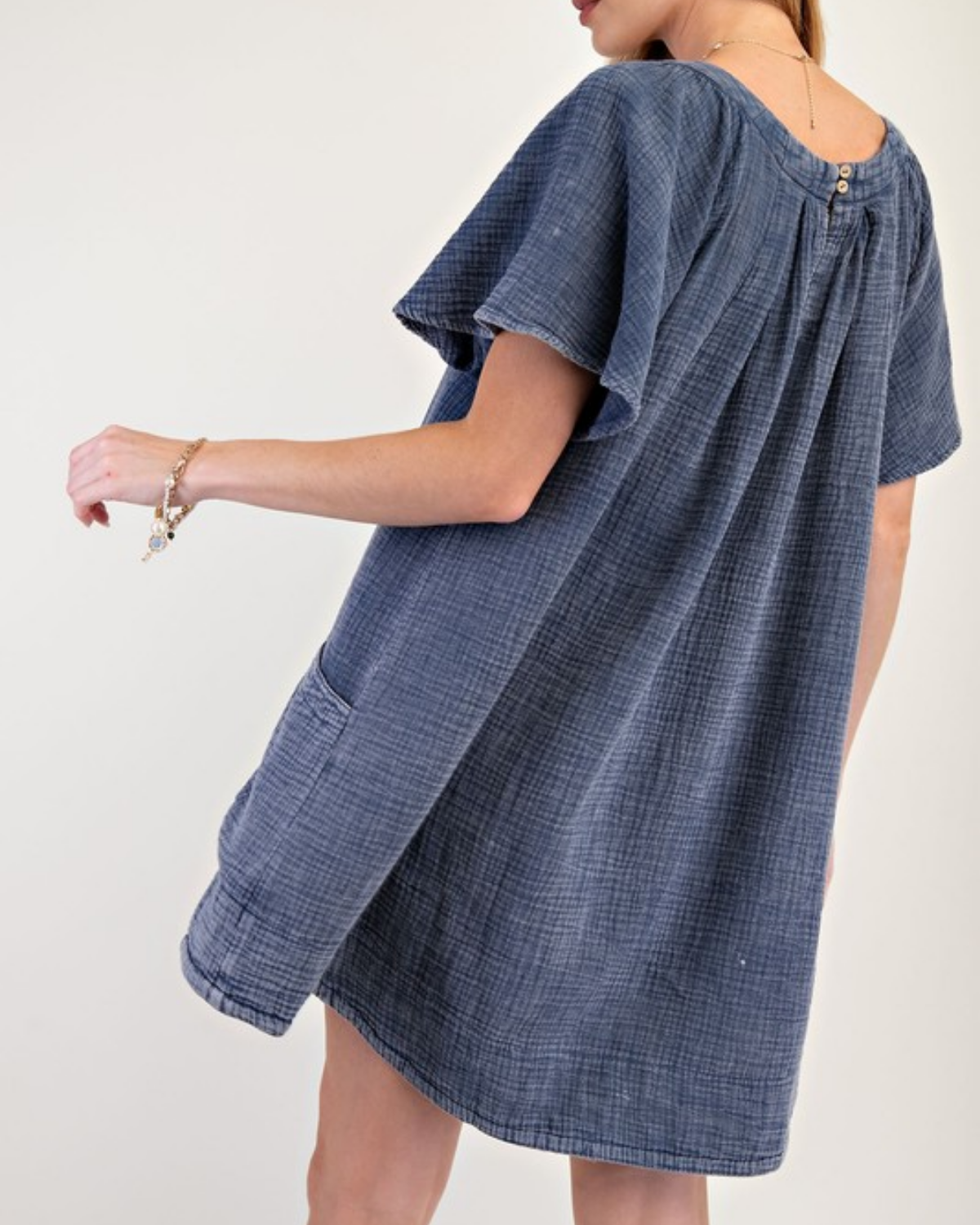 This mini dress is all about effortless comfort and carefree style. The soft cotton gauze fabric makes it perfect for those lazy, sunny days, while the flowy cut offers a relaxed, flattering fit. Pair it with sandals for a beachy vibe, or dress it up with accessories for a night out—either way, you’ll love the feel and look of this dress.