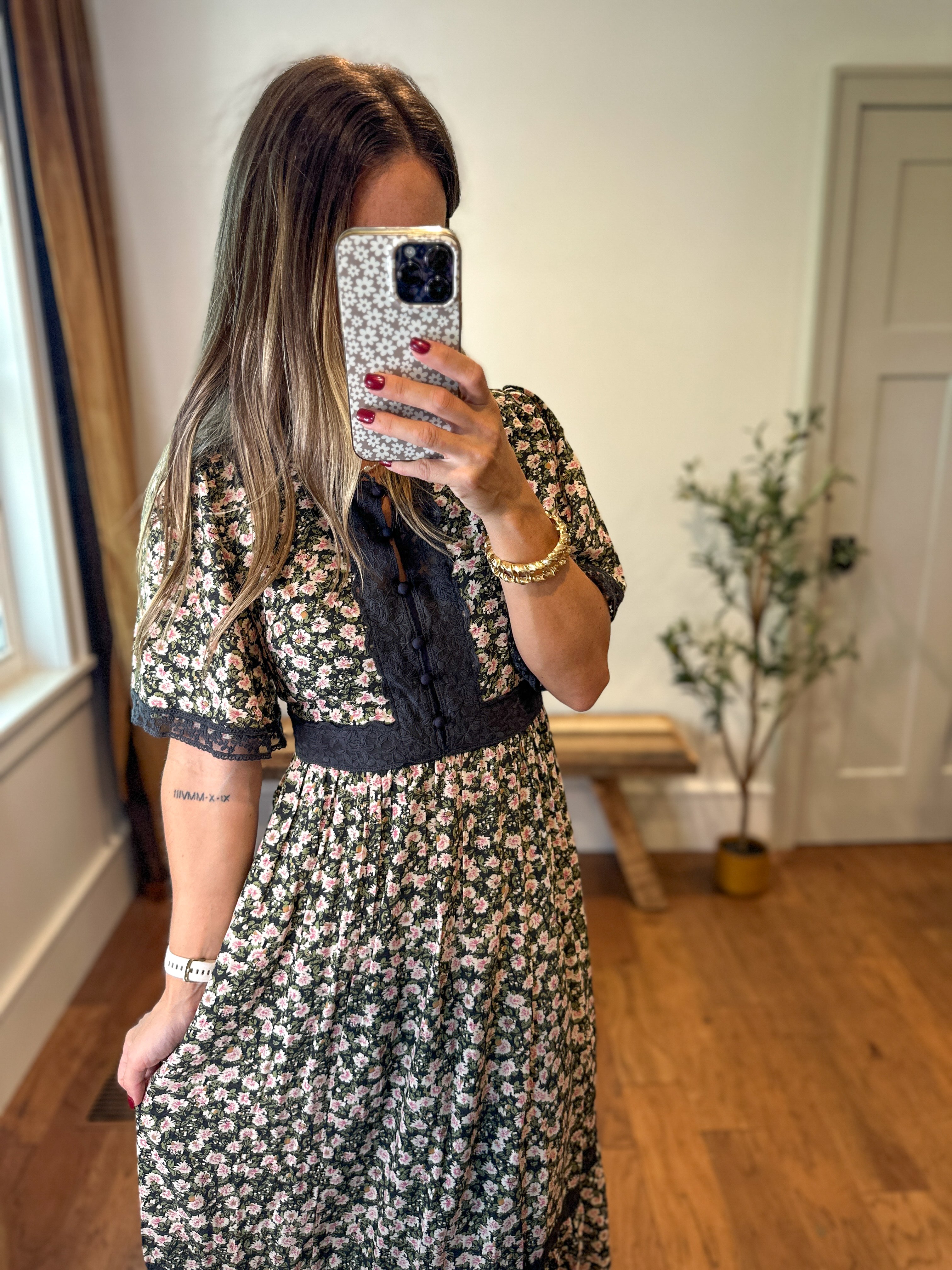 Vintage-inspired floral print with contrast lace insets