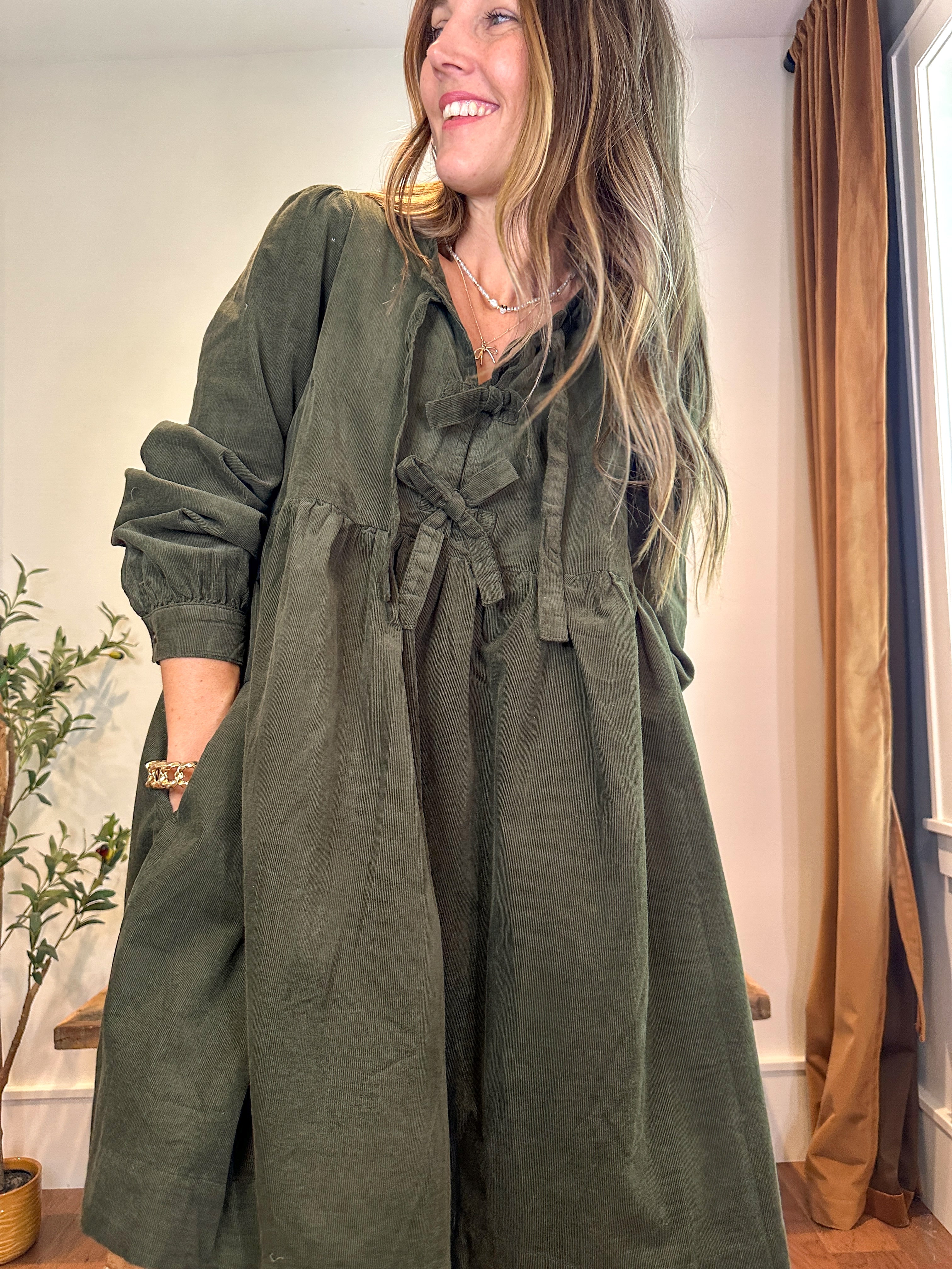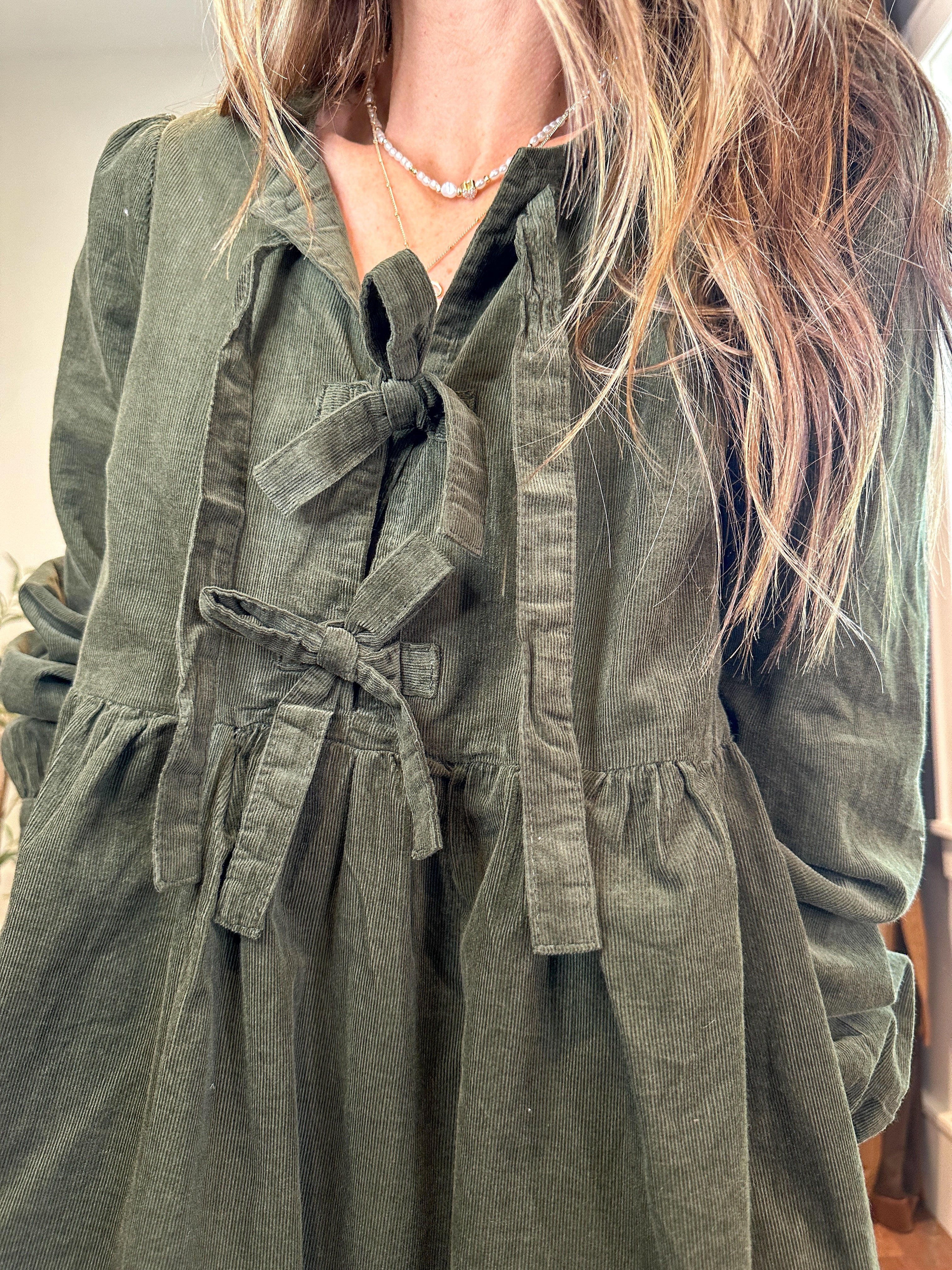 Stay cozy and stylish on cooler days with the Sage & Bow Mini Dress. Crafted from soft, textured cotton corduroy, this babydoll silhouette offers a relaxed, flowy fit for all-day comfort. Long sleeves with gathered cuffs, charming front tie bows, and a playful mini length make it a sweet and versatile wardrobe staple. Side pockets add practicality, while the lined design ensures a polished, comfortable finish. Perfect for layering with boots or sneakers for a chic, autumn-ready look.