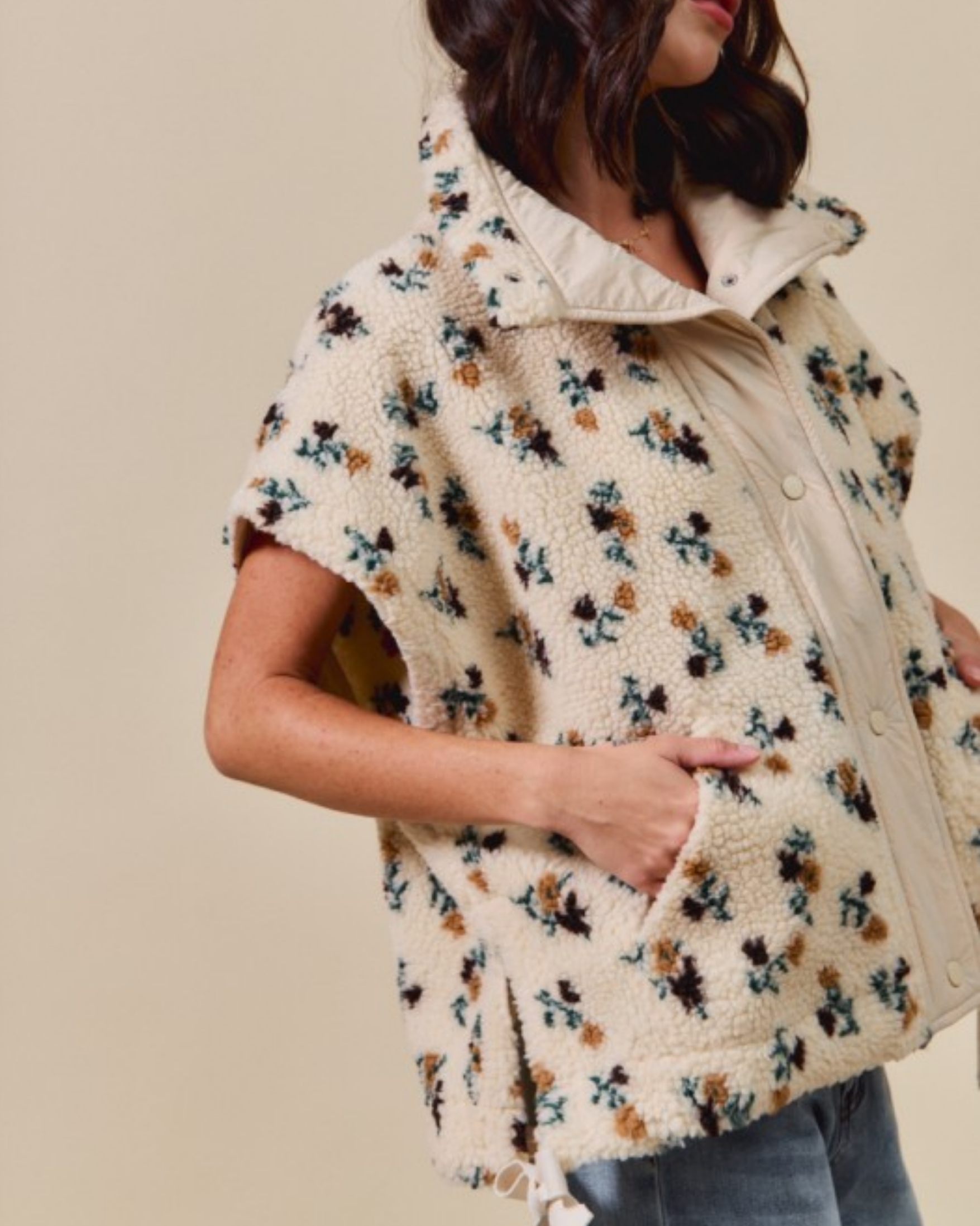 Bring warmth and whimsical style to your wardrobe with the Wildflower Cozy Sherpa Vest. This oversized, sleeveless vest features ultra-soft sherpa fur in a subtle floral design, combining comfort with playful charm. Perfect for layering over sweaters, long-sleeve tops, or dresses, it adds texture, warmth, and a touch of cozy elegance to fall and winter outfits. Effortlessly chic, it’s ideal for casual days, weekend adventures, or cozy evenings out.