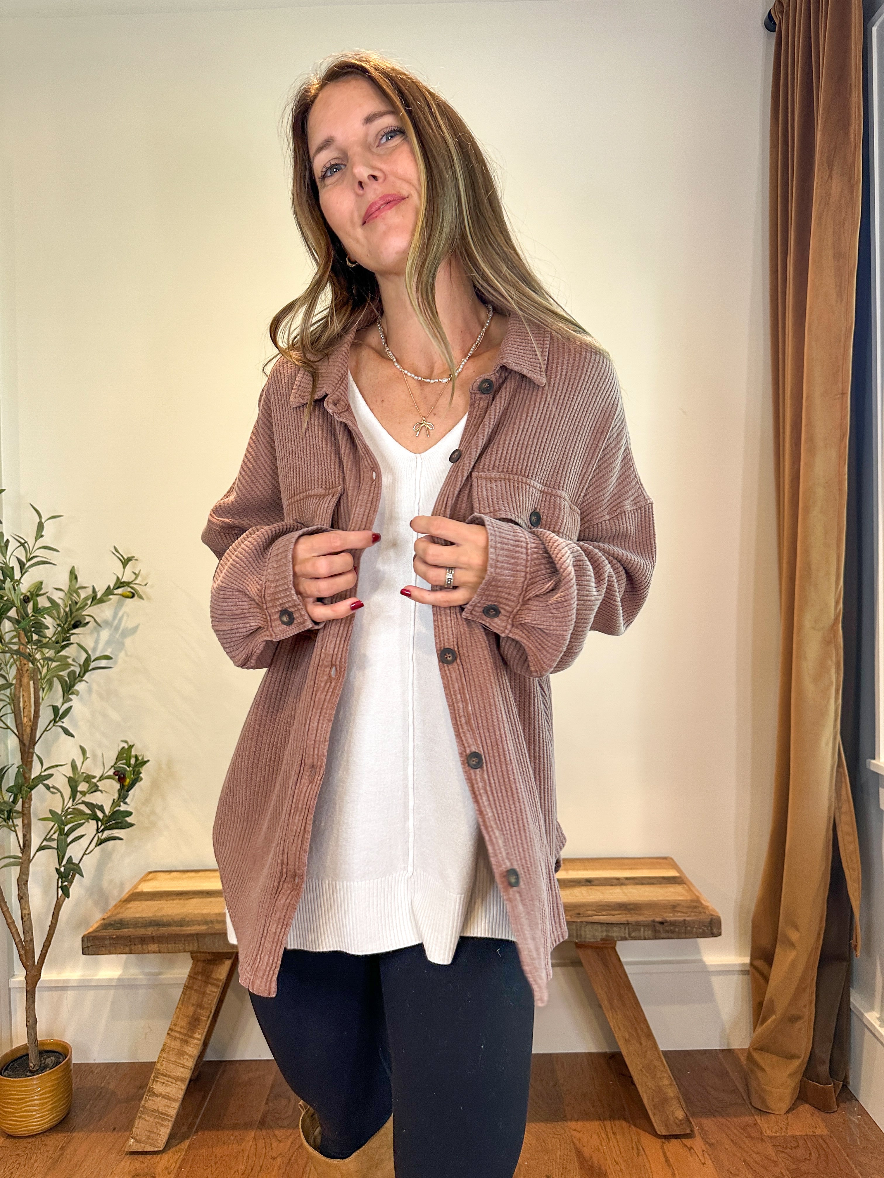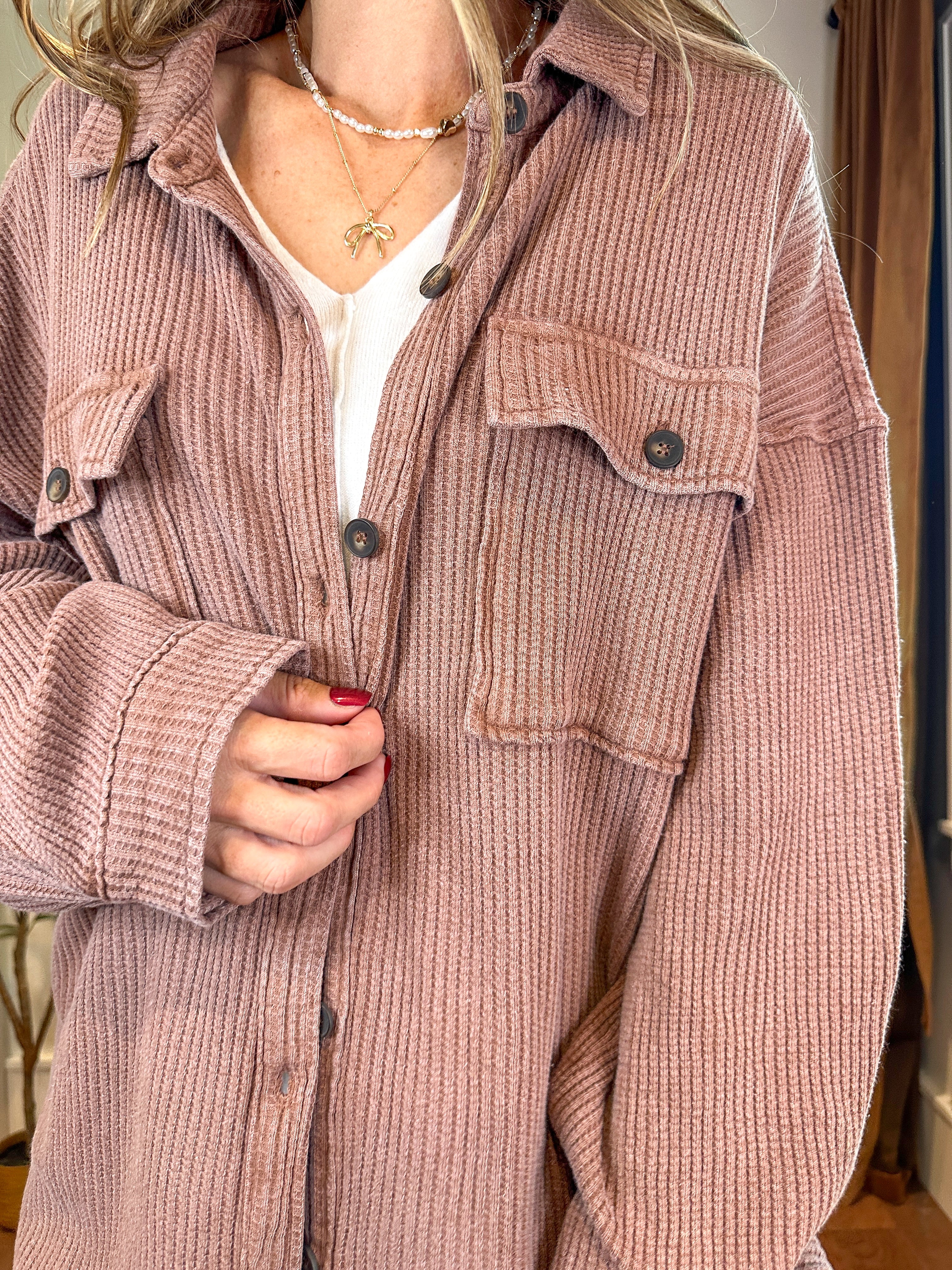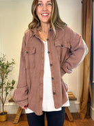Elevate your casual wardrobe with the Maplewood Waffle Shacket. Crafted from 100% soft cotton, this oversized mineral-washed button-up combines the cozy texture of a waffle knit with a laid-back, effortlessly cool vibe. Its roomy fit makes layering a breeze, perfect over tees, sweaters, or light knits. Whether you’re running errands, meeting friends, or enjoying a crisp fall day, this shacket is a versatile staple for relaxed, trend-forward style.