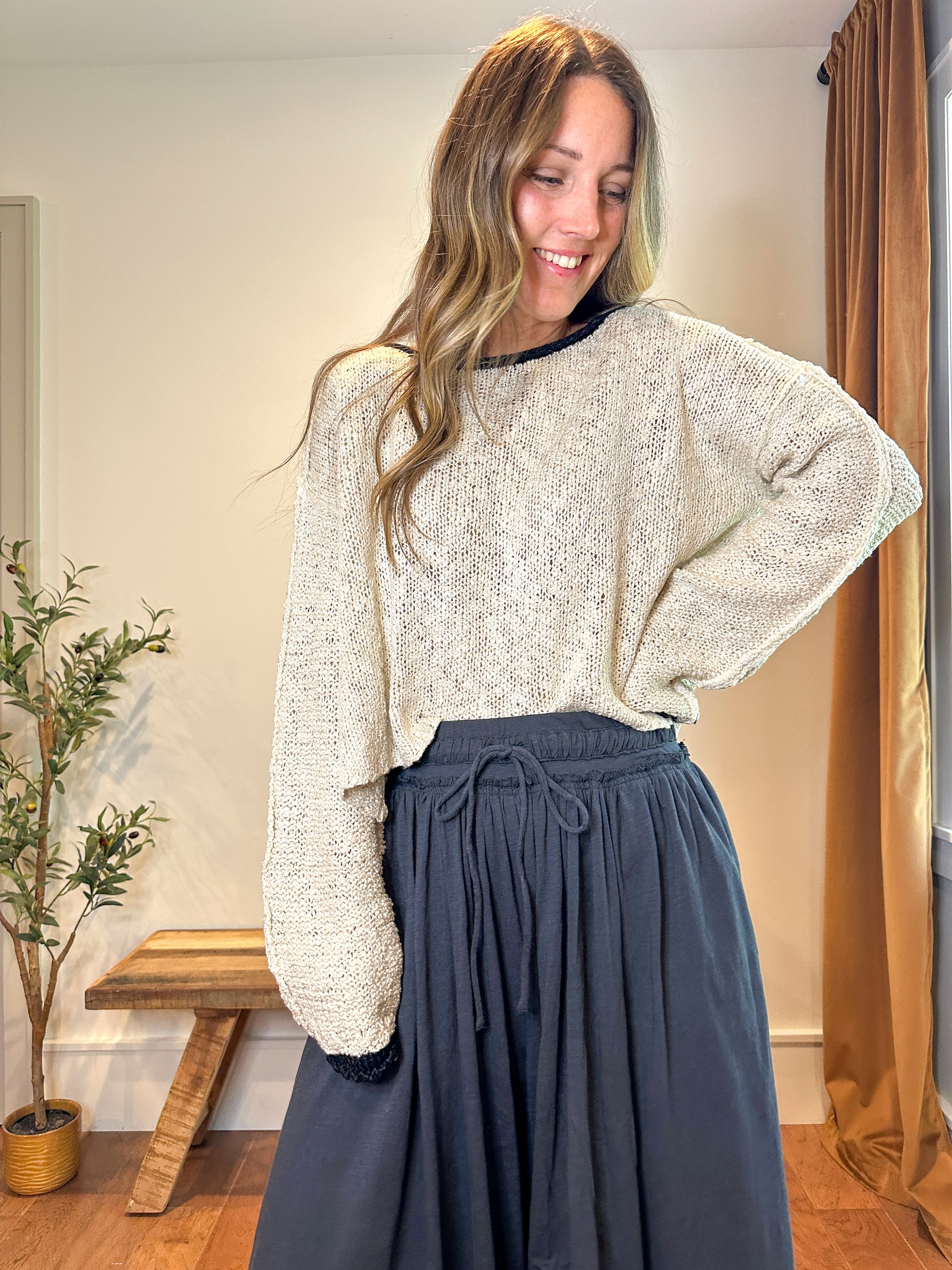 Effortlessly chic and cozy, the Café Mocha Contrast Knit Sweater brings texture and subtle detail to your wardrobe. Crafted in a soft oatmeal open knit, this relaxed-fit top features striking black contrast trim along the edges and side slits for easy movement. Perfect for layering over jeans, skirts, or leggings, it adds a modern, polished touch to casual outfits while keeping you comfortable and stylish.