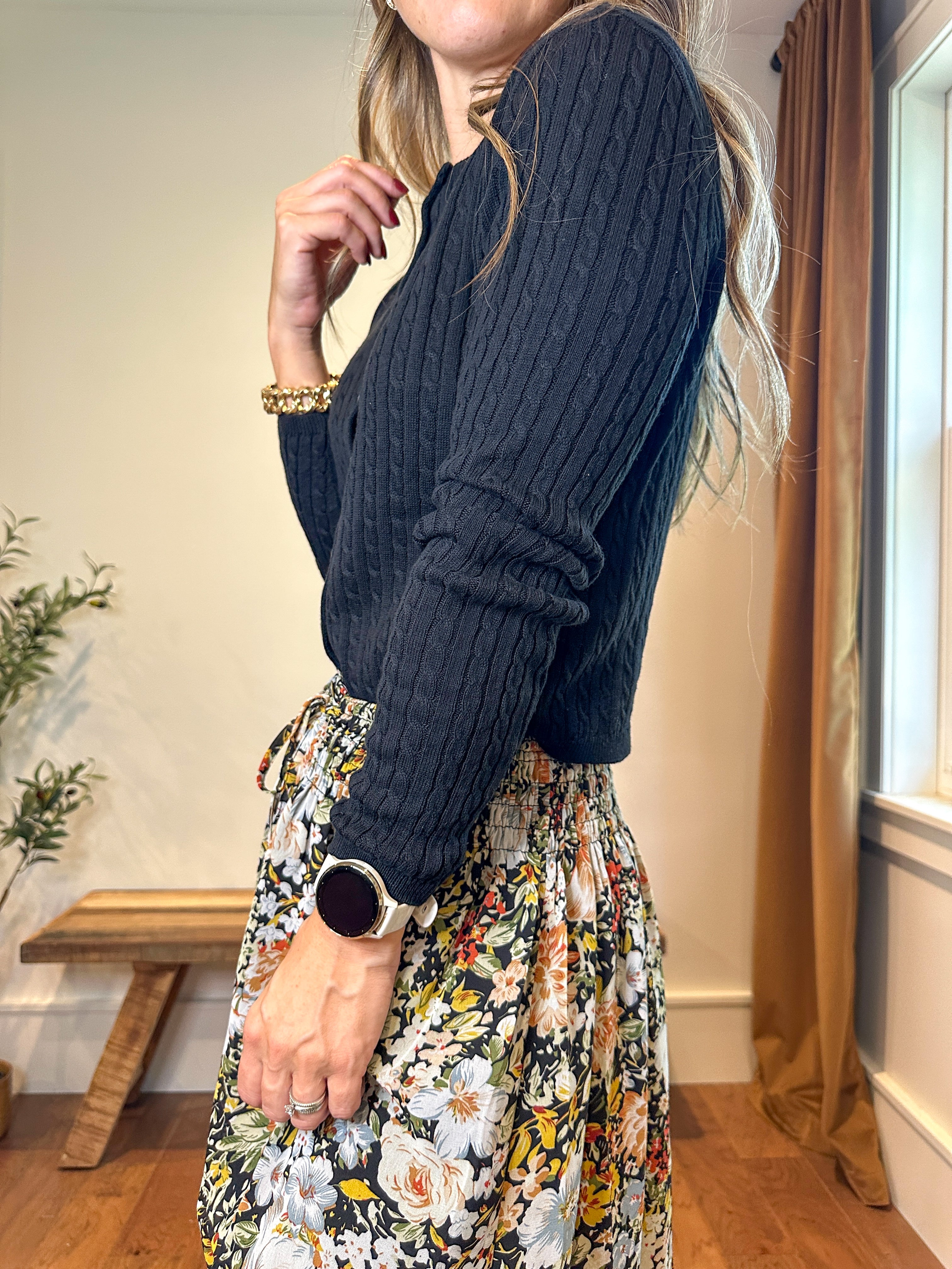 Stay cozy and effortlessly chic with the Autumn Stroll Cable Cardigan. Crafted from a soft cotton-acrylic blend, this long-sleeve cardigan features timeless cable-knit detailing and a classic buttoned front. Its slim-fit silhouette makes it perfect for layering over dresses, blouses, or casual tees, offering a polished yet relaxed look. Dress it up for work or down for weekend outings—an essential piece for versatile, fall-ready style.