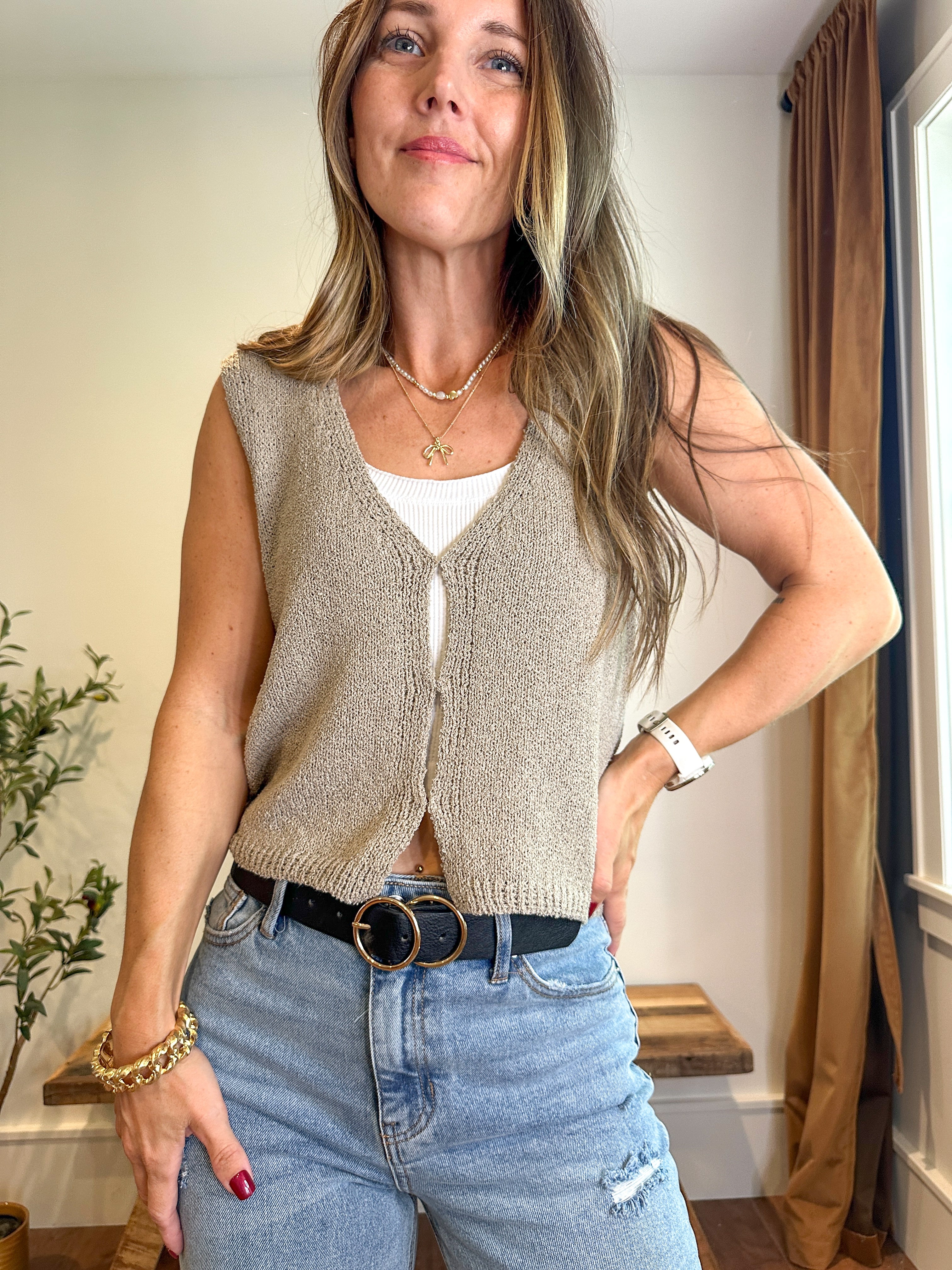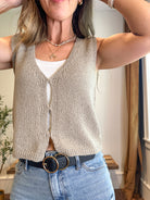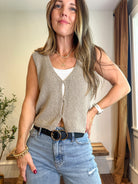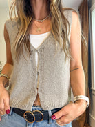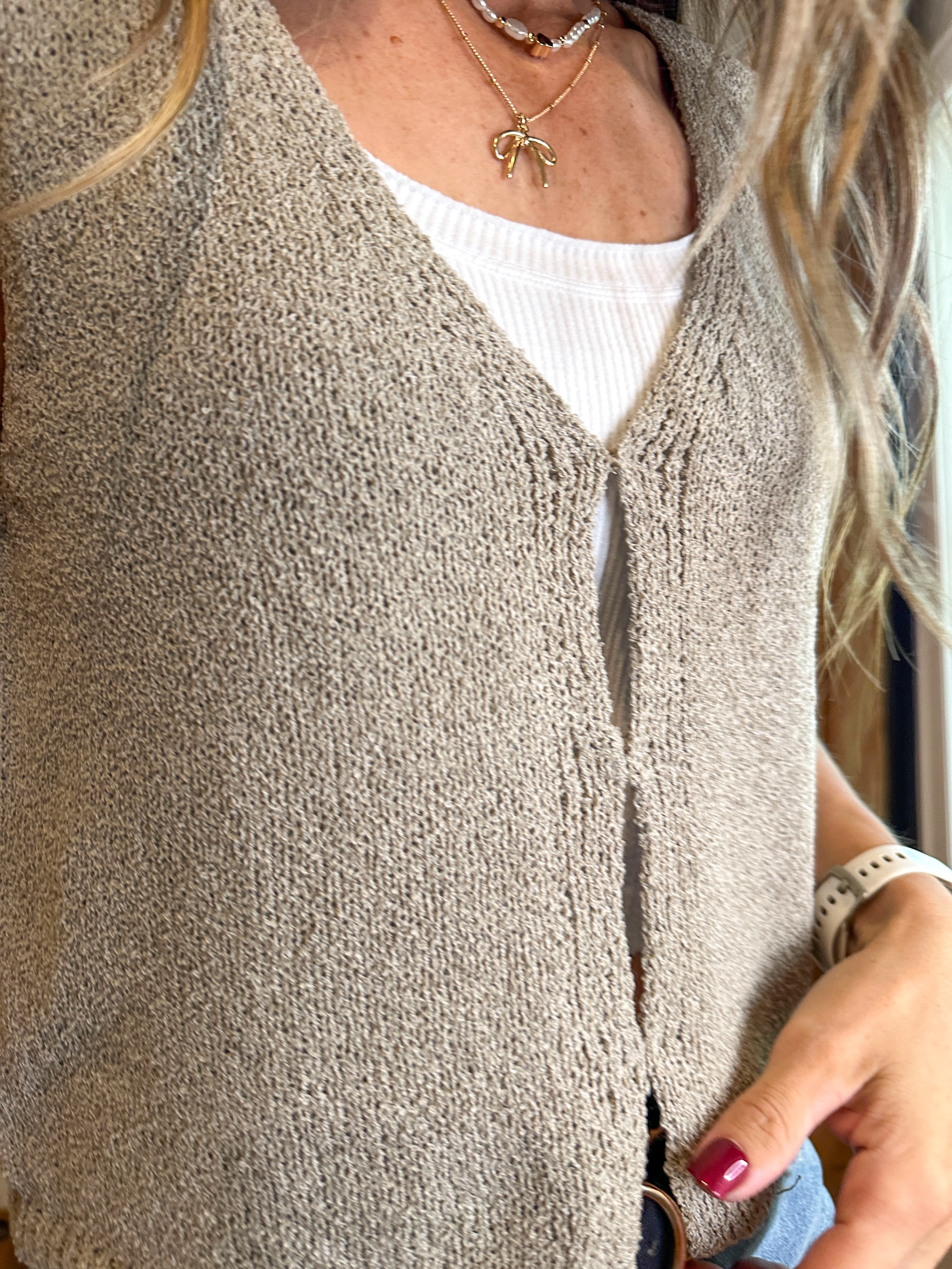 Add a touch of cozy sophistication with the Autumn Charm Knit Vest. This mocha-toned knit vest features a flattering sleeveless design with three front hook-and-eye closures, offering a chic layered look over shirts, blouses, or dresses. Its soft knit fabric and versatile silhouette make it a perfect fall staple, combining warmth, comfort, and effortless style.