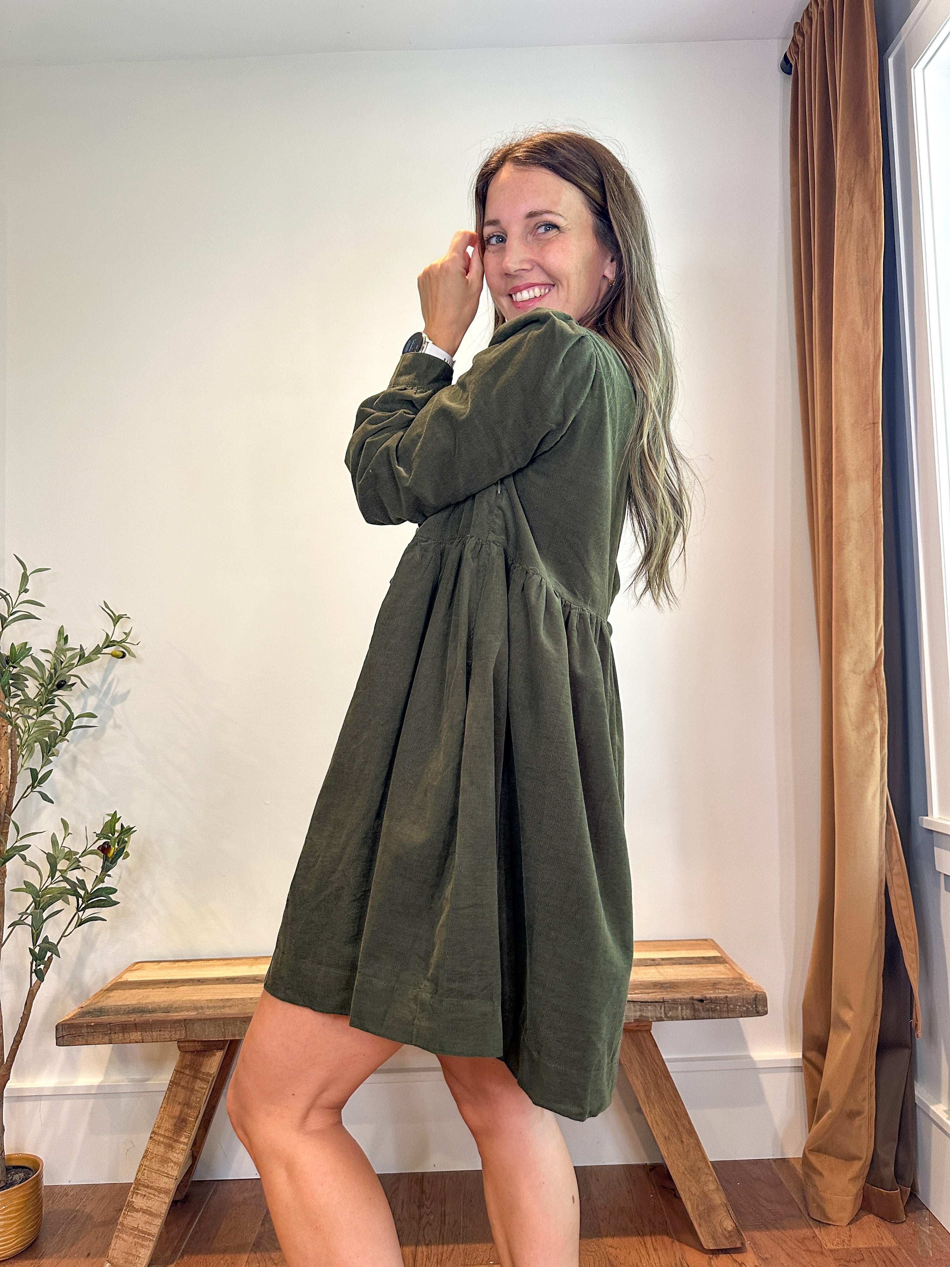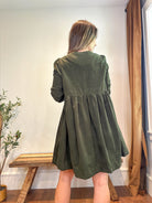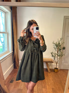 Stay cozy and stylish on cooler days with the Sage & Bow Mini Dress. Crafted from soft, textured cotton corduroy, this babydoll silhouette offers a relaxed, flowy fit for all-day comfort. Long sleeves with gathered cuffs, charming front tie bows, and a playful mini length make it a sweet and versatile wardrobe staple. Side pockets add practicality, while the lined design ensures a polished, comfortable finish. Perfect for layering with boots or sneakers for a chic, autumn-ready look.