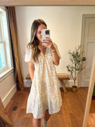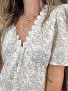 Embrace effortless charm with the Willow Leaf Mini Dress. Crafted from lightweight cotton gauze, this dress features a delicate leaf print, scallop-trimmed edges, and a flattering V-neckline. The elasticized empire waist and tiered mini length create a relaxed, flowy silhouette, perfect for sunny days or layering with a cozy sweater in cooler weather. An easy, breezy piece that combines comfort and feminine style.